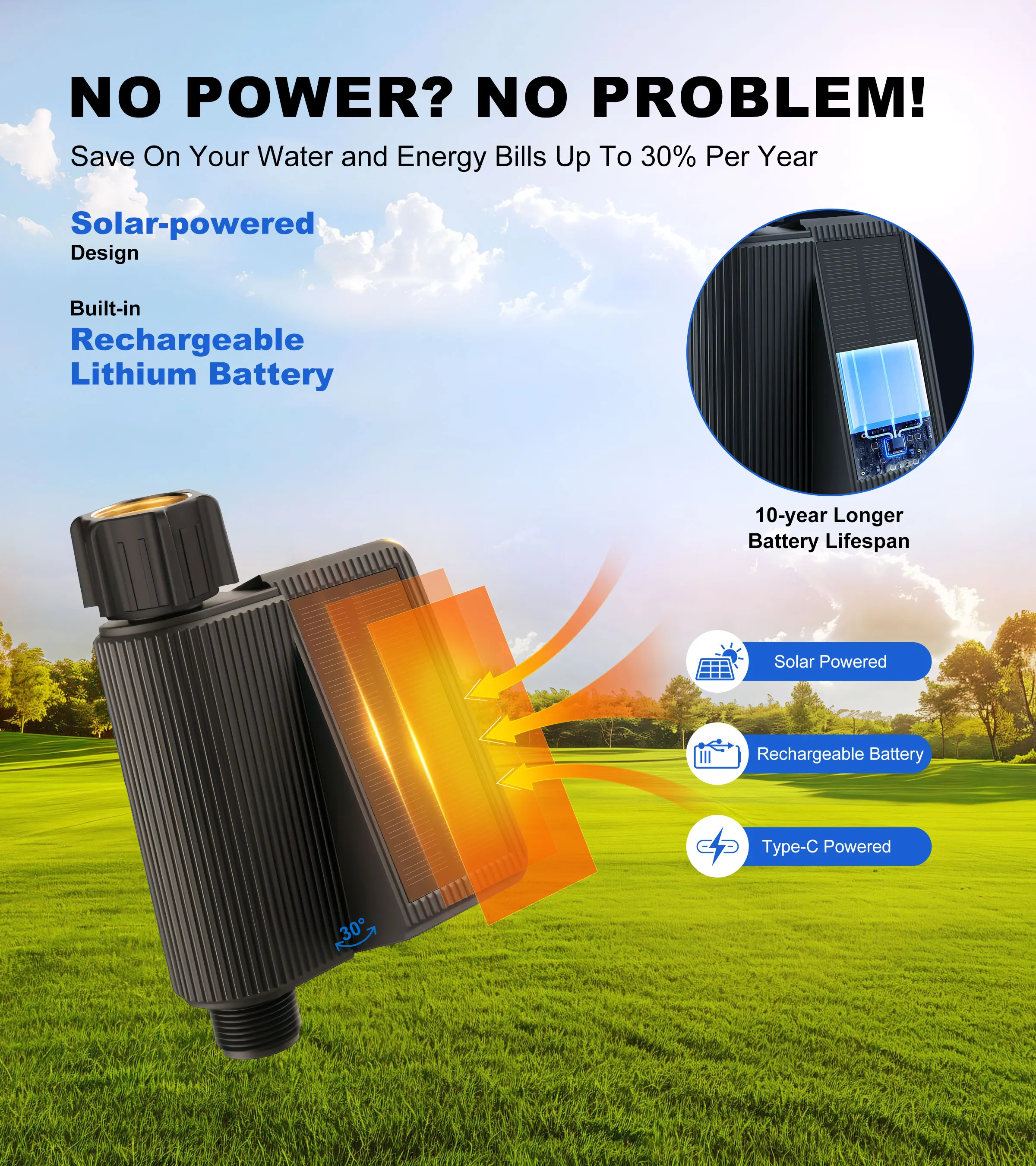 Experience hassle-free irrigation with our water timer, designed for longevity. Once installed, its battery powers up to 10 years, thanks to an efficient solar panel that charges even on cloudy days and under dim light, ensuring continuous operation while saving energy. Embrace eco-friendliness and reduce your carbon footprint by harnessing clean energy.