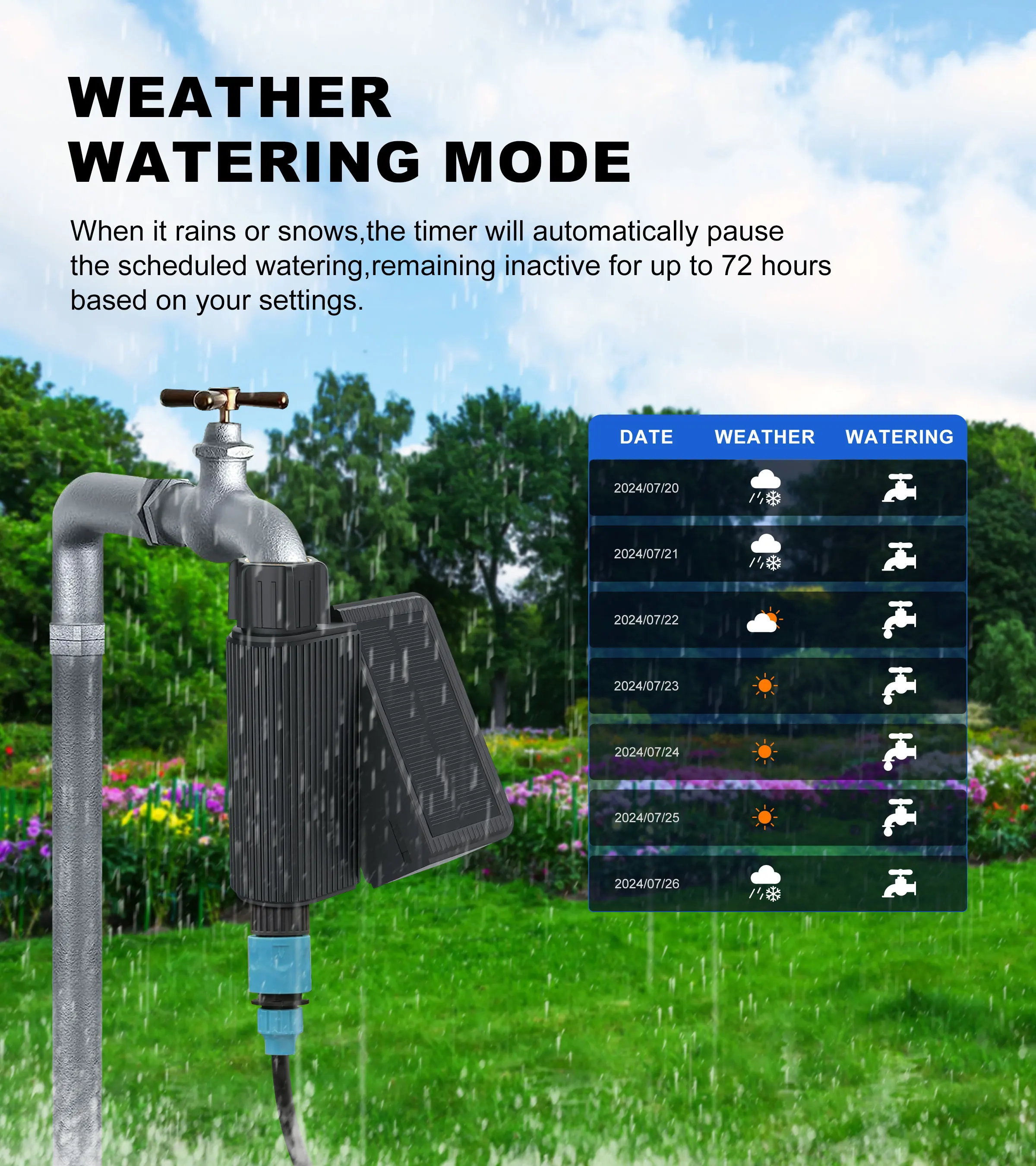 When it rains or snows, the timer will automatically pause the scheduled watering, remaining inactive for up to 72 hours based on your settings.