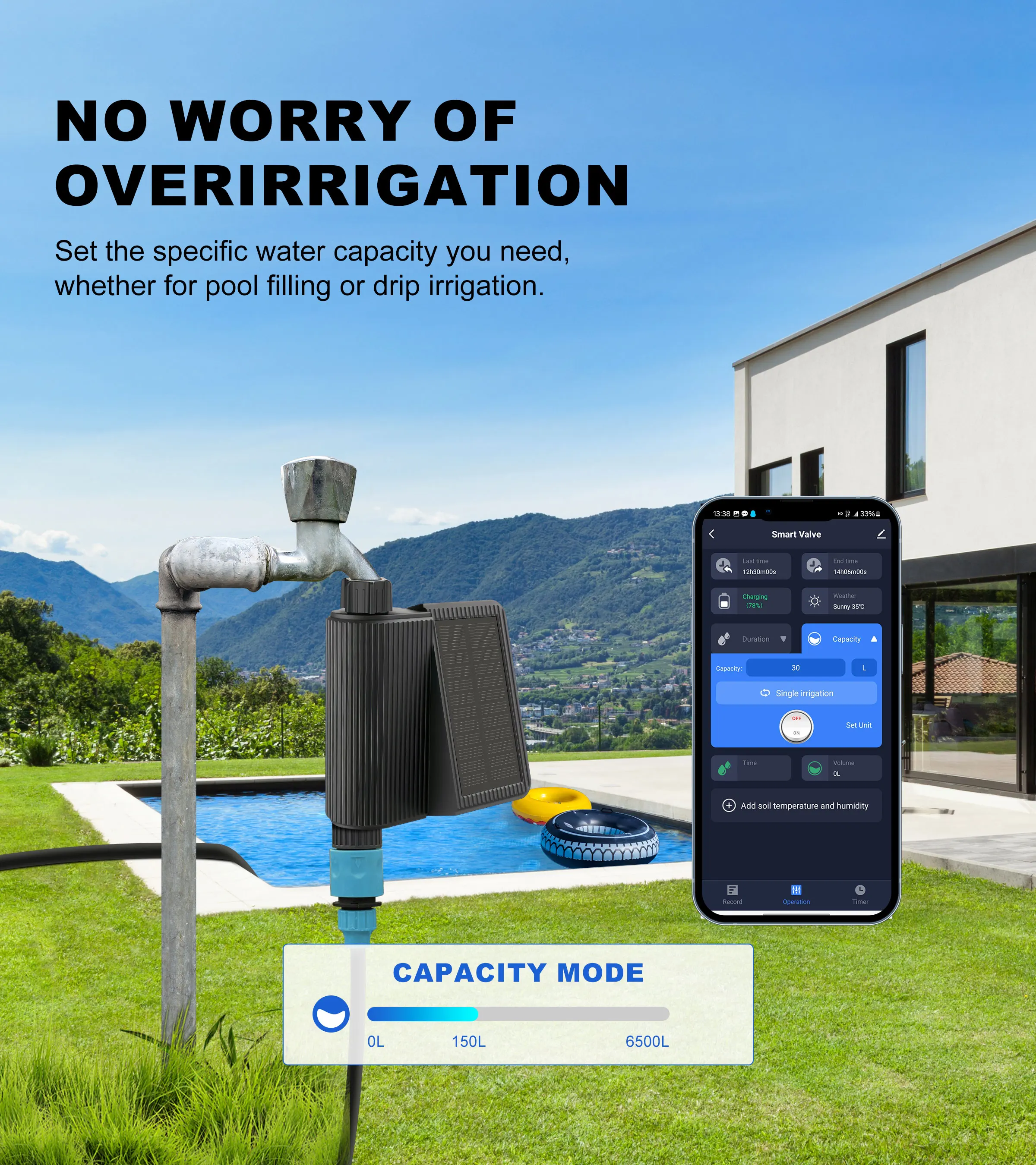 Set the specific water capacity you need, whether for pool filling or drip irrigation.