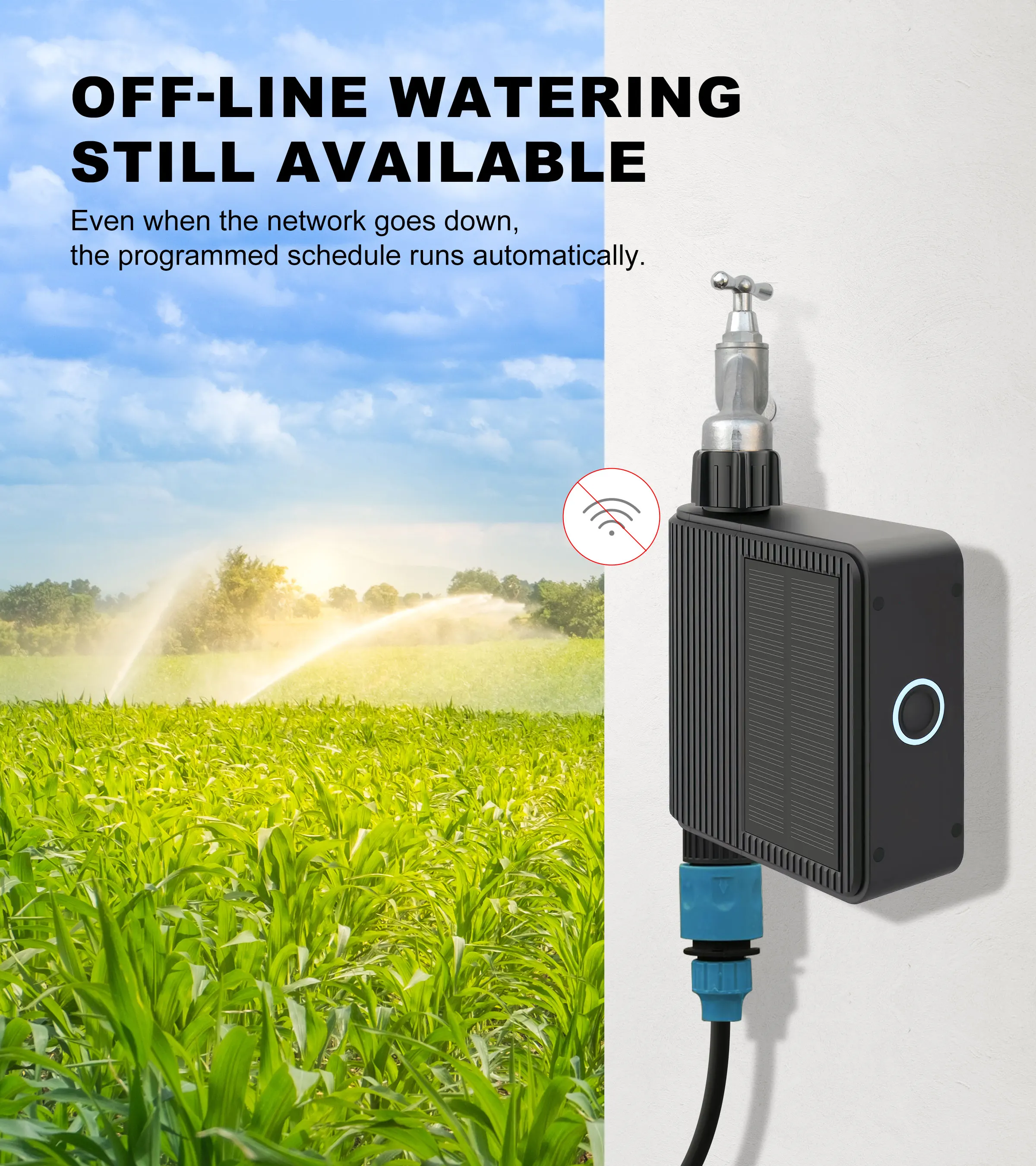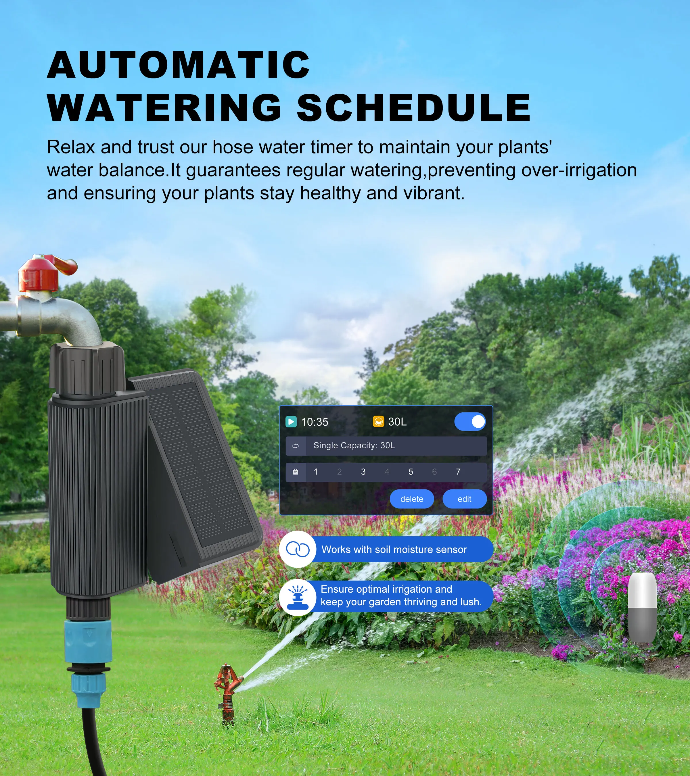 When encountering a rainy or snowy day, it will automatically pause watering for up to 72 hours. This feature helps reduce unnecessary water waste and prevents overirrigation.
