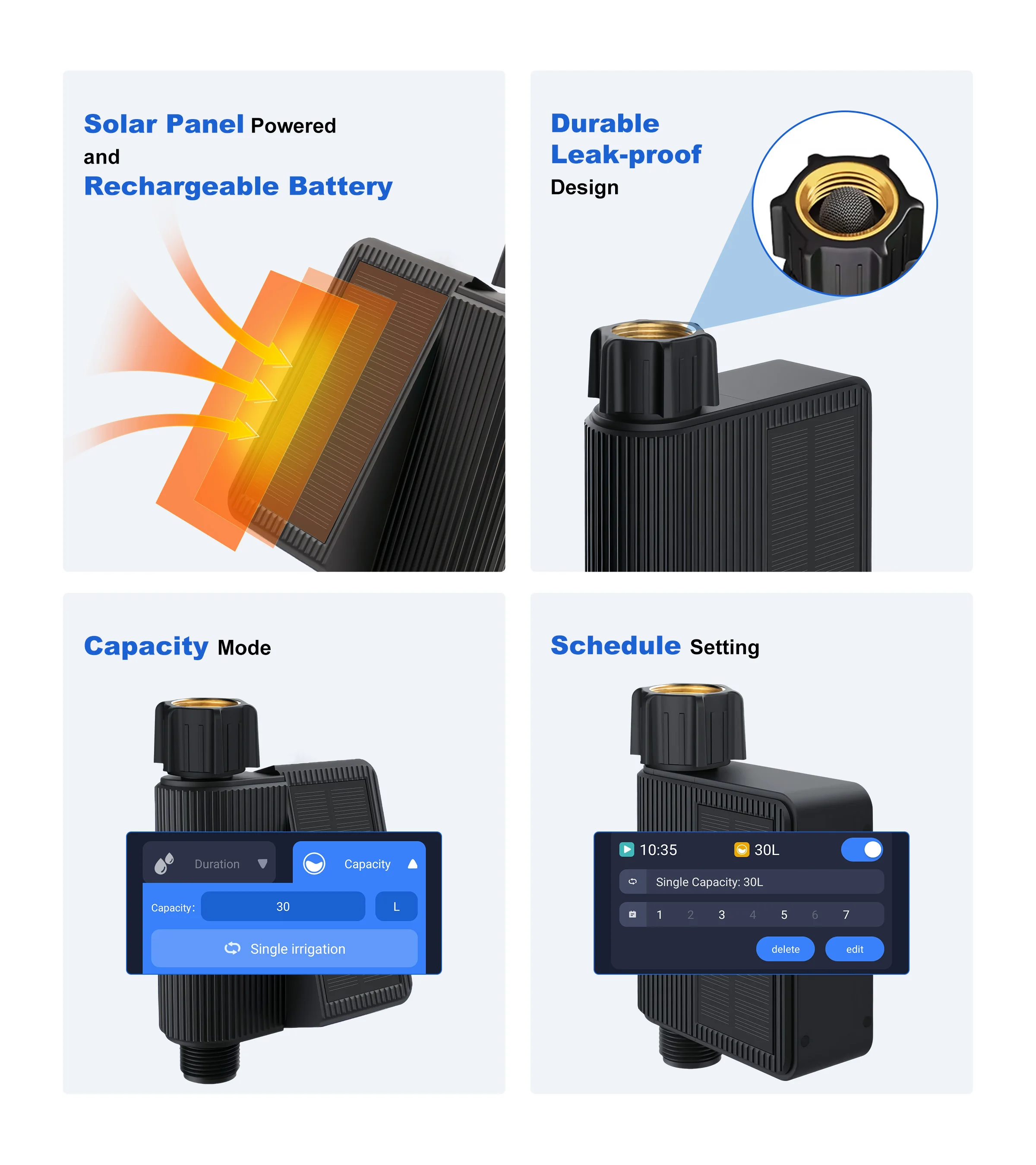 Always worry about forgetting to water or turn off the water timer? Rest assured now with our hose faucet timer. You can easily program watering schedules up to 10 sets for your garden irrigation, also including the amount of watering for each time. Even when the network goes down, the programmed schedule runs automatically. Never worry about wasting water or losing your plants due to lack of water.