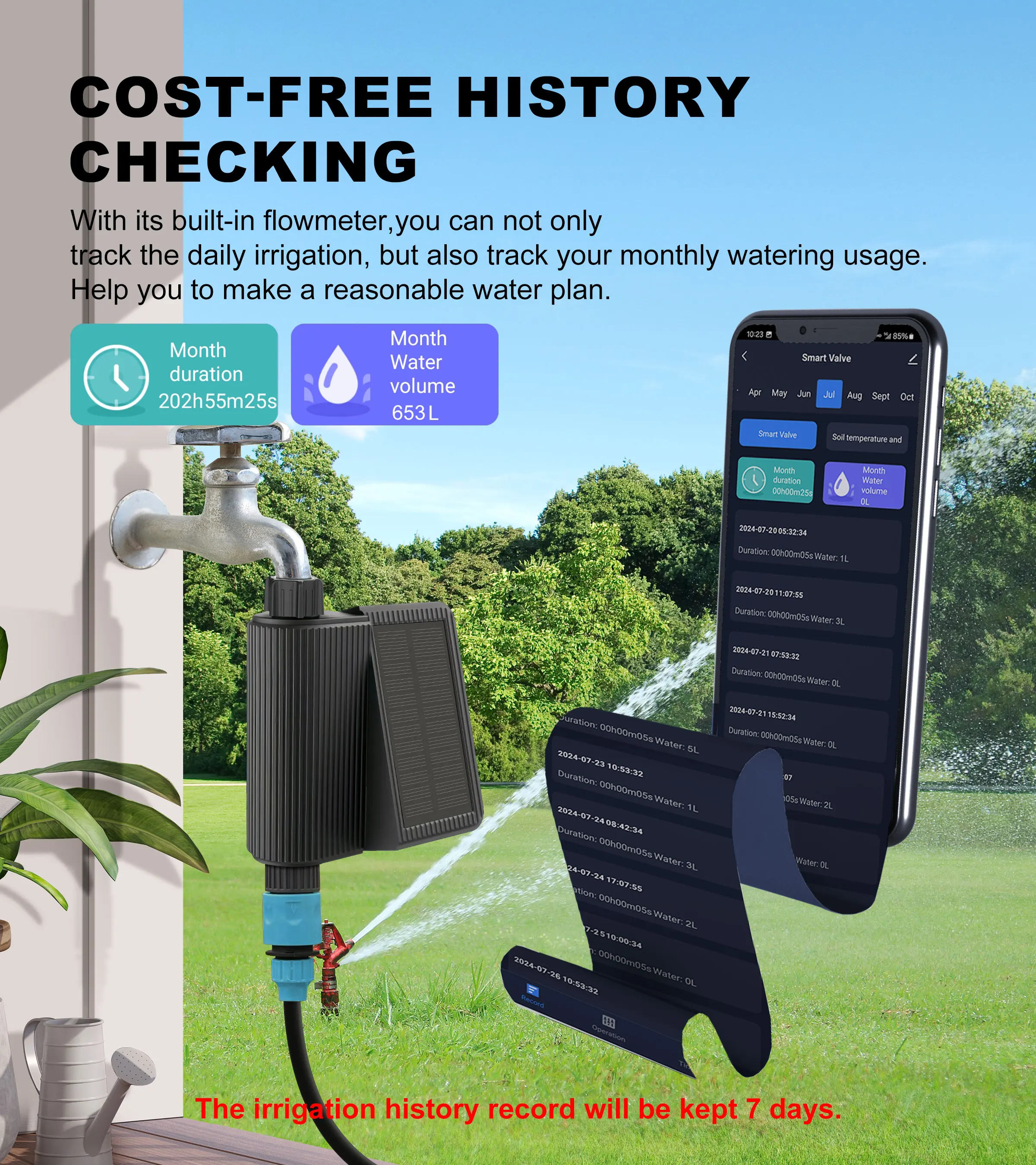 With its built-in flowmeter, you can not only track the daily irrigation, but also track your monthly watering usage. Help you to make a reasonable water plan.