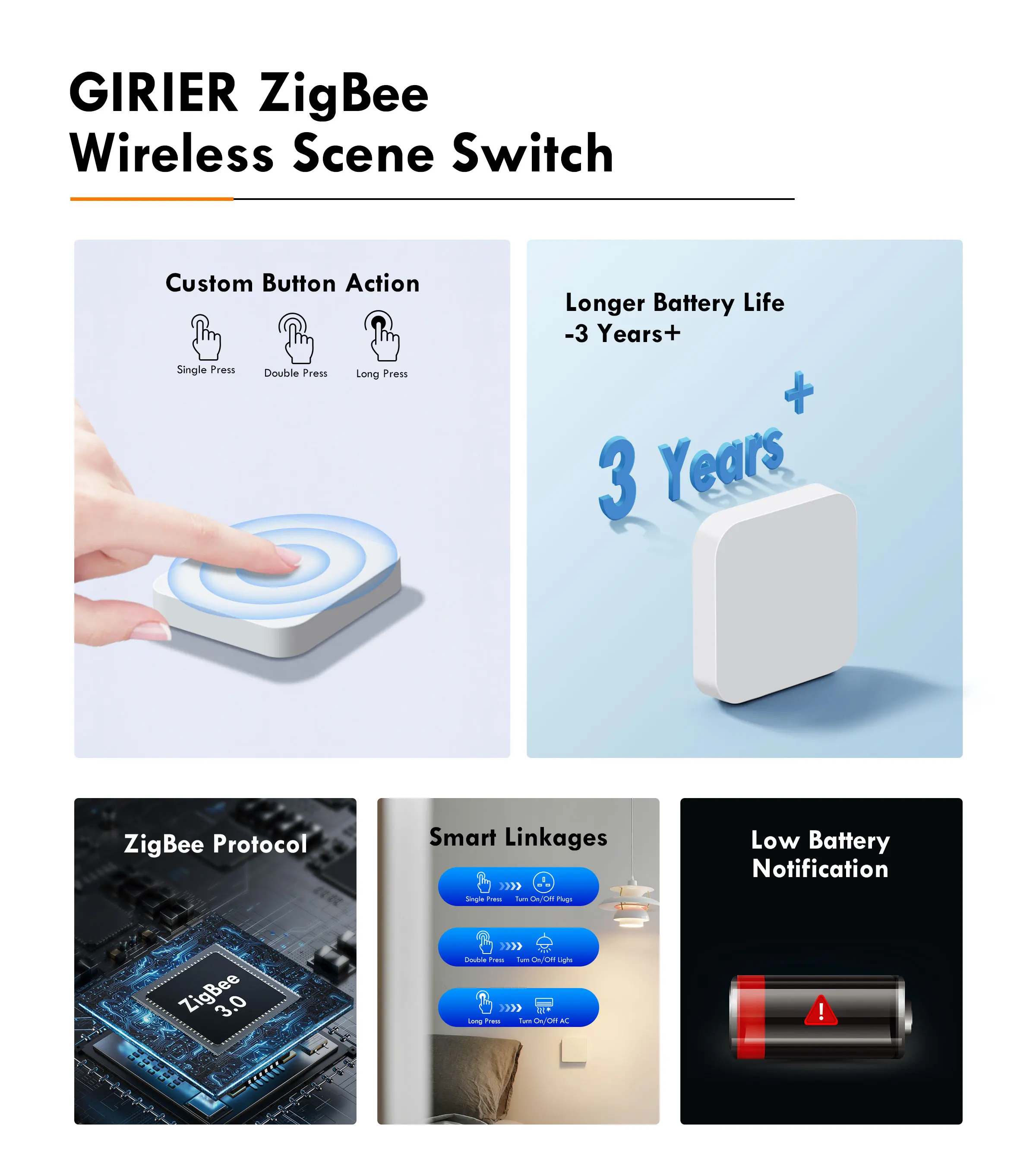 GIRIER ZigBee 3.0 Scene Button Switch Smart Wireless One Key Scene Controller Multi-scene Linkage Switch Supports Home Assistant