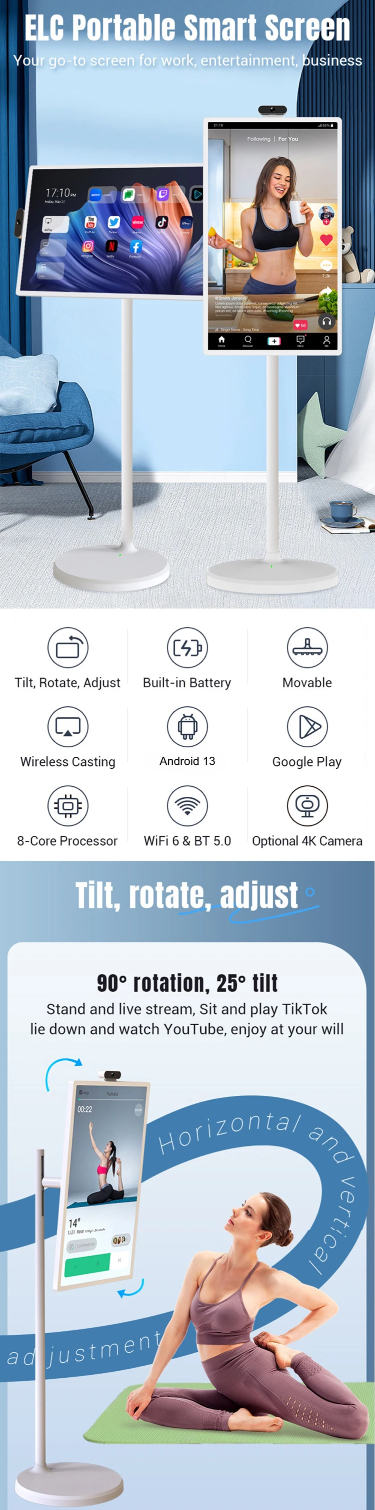 21.5 Inch Monitor Screen Smart TV Android13 Touch Screens Portable Interactive Digital Signage For Fitness Optional Camera