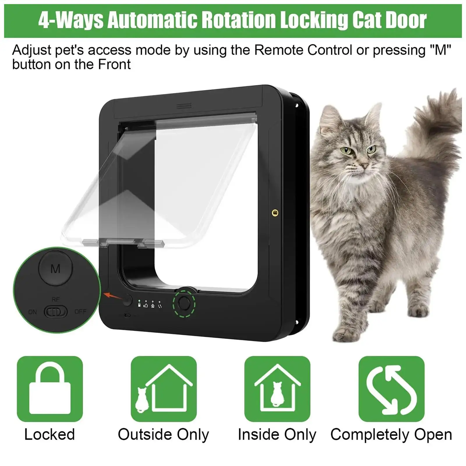 2.Flexible Entry Solutions: Smart Cat Door provides flexible 4 access modes with lock-exit control, enabling flexible access for cats in diverse scenarios, such as daytime roaming or nighttime restrictions