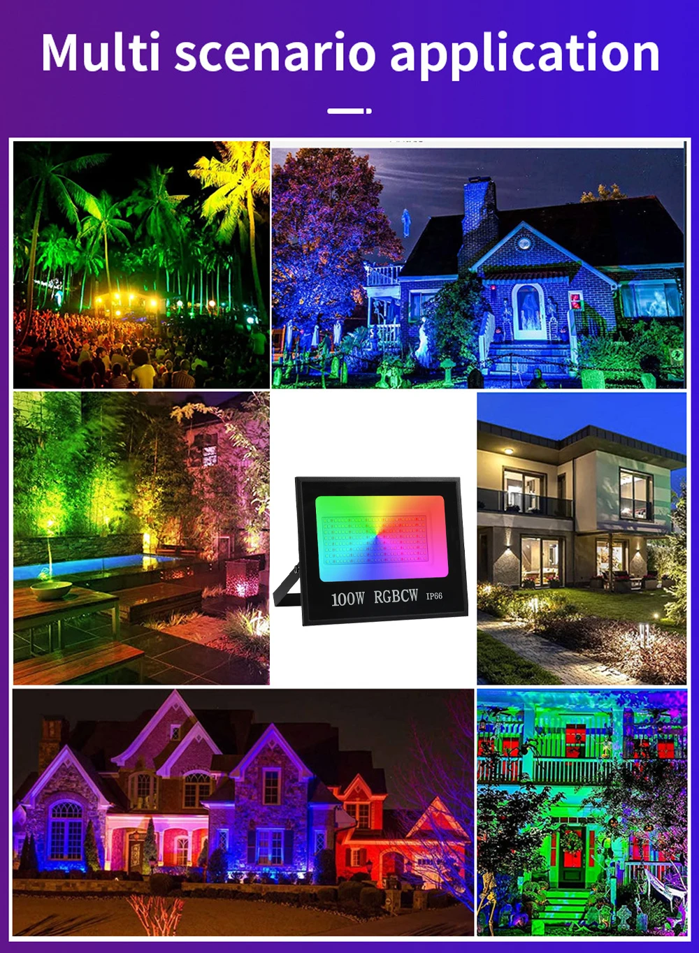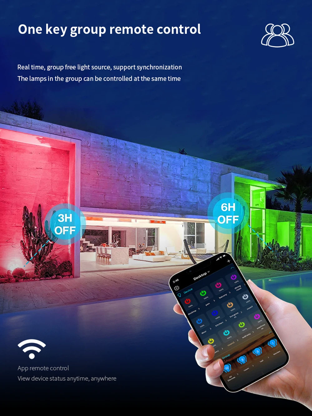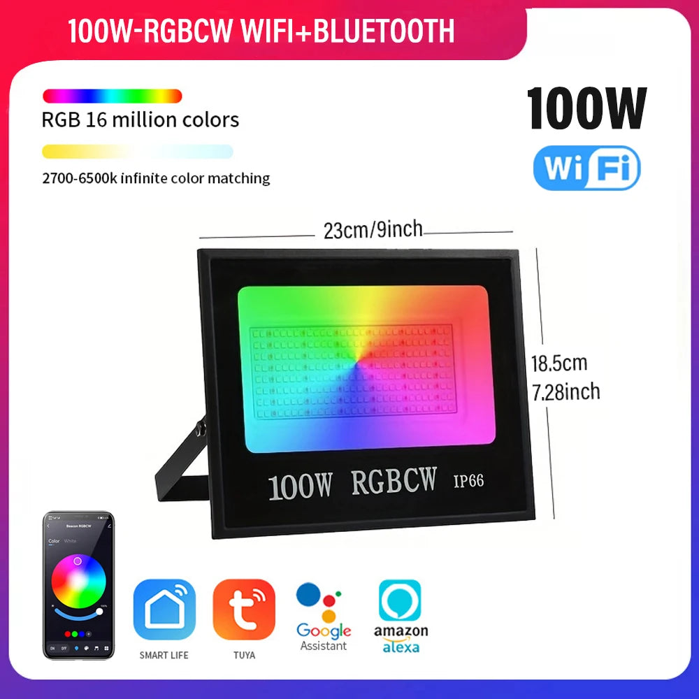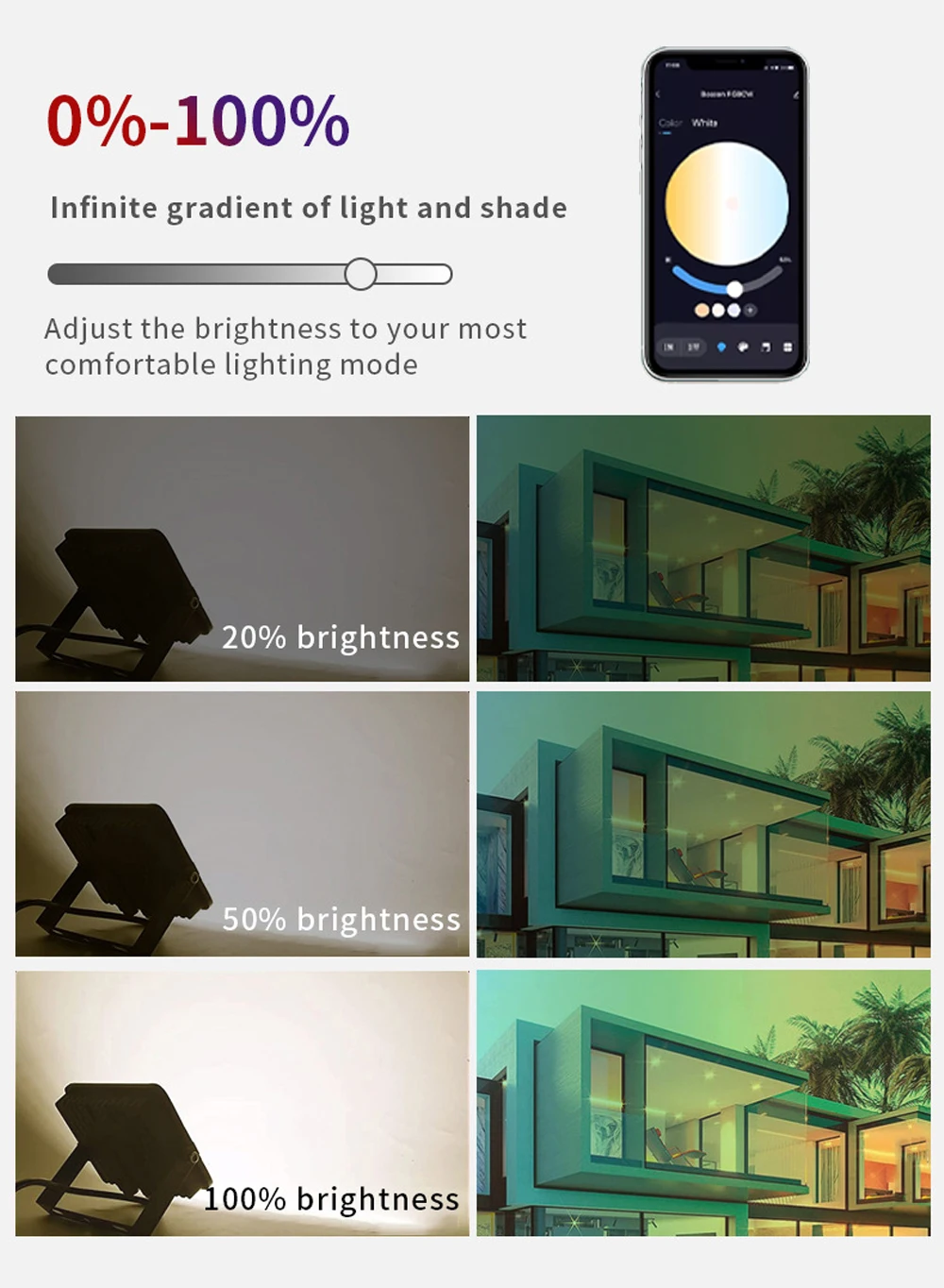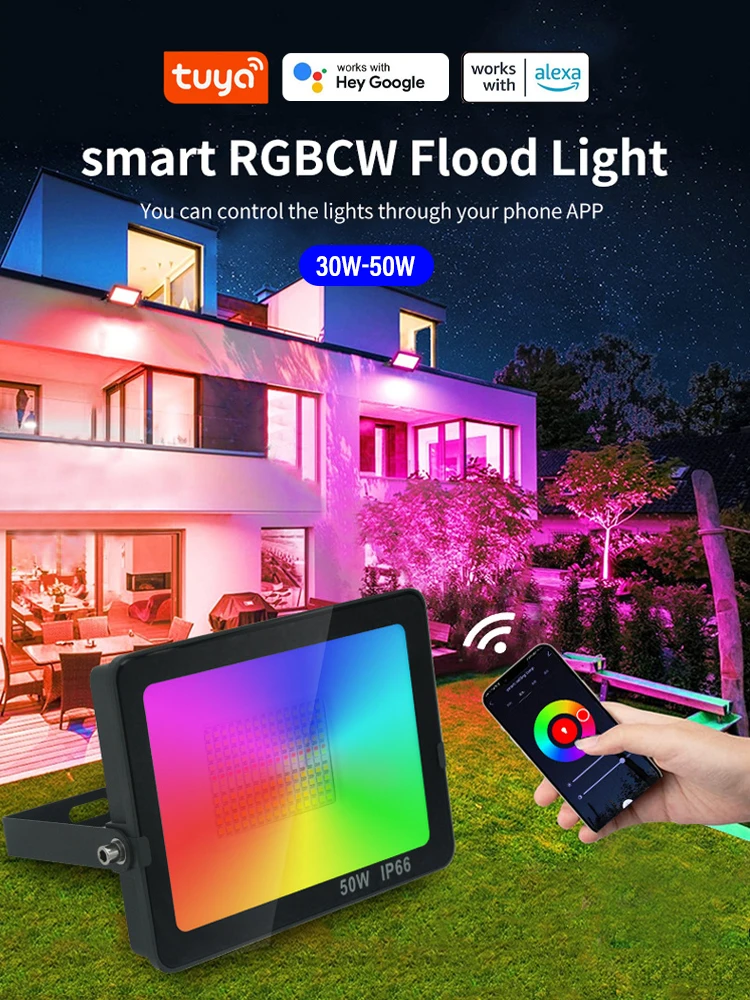 Outdoor RGBCW Smart Floodlight has 16 million colors Adjustable color temperature WIFI and wireless connectivity for patio