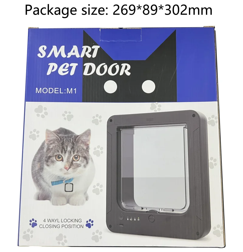 Smart Cat Door Feature *Scans animal on entry - keeps out intruder animals: 4 exit/entry modes *LED status: 4 types *Flap opening dimensions: W(mm) × H(mm)190 x 205 *Required install hole size: W(mm) × H(mm)263 × 298 *Batteries required: 4X AAA *Work Time: 12 months *RFID Collar Tag included: Yes *Remote Control: Optional *Standard Accessories: 2 tag keys, 1 necklace, 8 screws User Manual Product Description