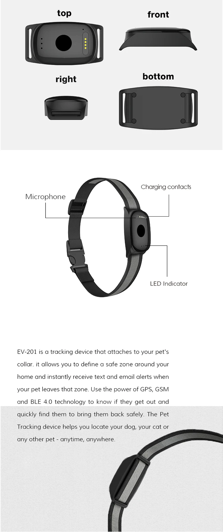 Product DescriptionGerneral specifications Mod EV-201 Dimension 2.4*1.4*0.6 inch / 61mm*35mm*16mm Weight 1.4 OZ/ 39g Backup battery Rechargeable, 3.7V,800mAh Charging voltage 5V DC Battery life Up to 5 days under normal use Waterproof IP67 Hardware Sensor Motion sensor Connectors 4 Pin-Magnet for charging SIM card slot Na-no SIM card Flash memory 1MB WIFI 802.11 b/g/n, 2.4G BLE BT5.0 LE GPS GPS chipset GPS and Glonass Receiver frequency 1575.42MHz Cold start approx 26s Warm start approx 2s Hot start approx 1s Antenna Built-in ceramic antenna Standard accessories EV-201 device Charger: UK/AU/EU/US plug for option Magnetic USB cable User manual Dog Collar Packing box Main Features :