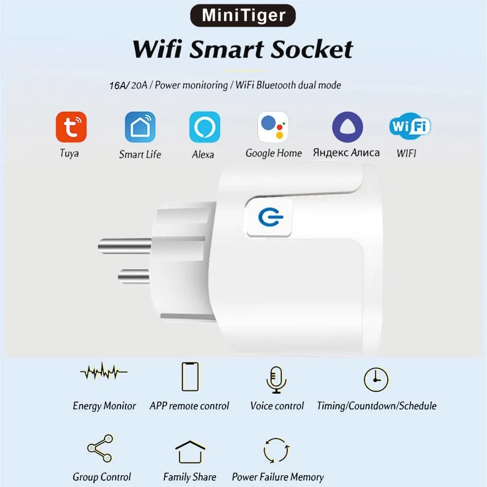 Smart Socket EU 16A/20A AC100-240V Wifi Smart Plug Power Outlet Home Voice Control, for Smart Life APP