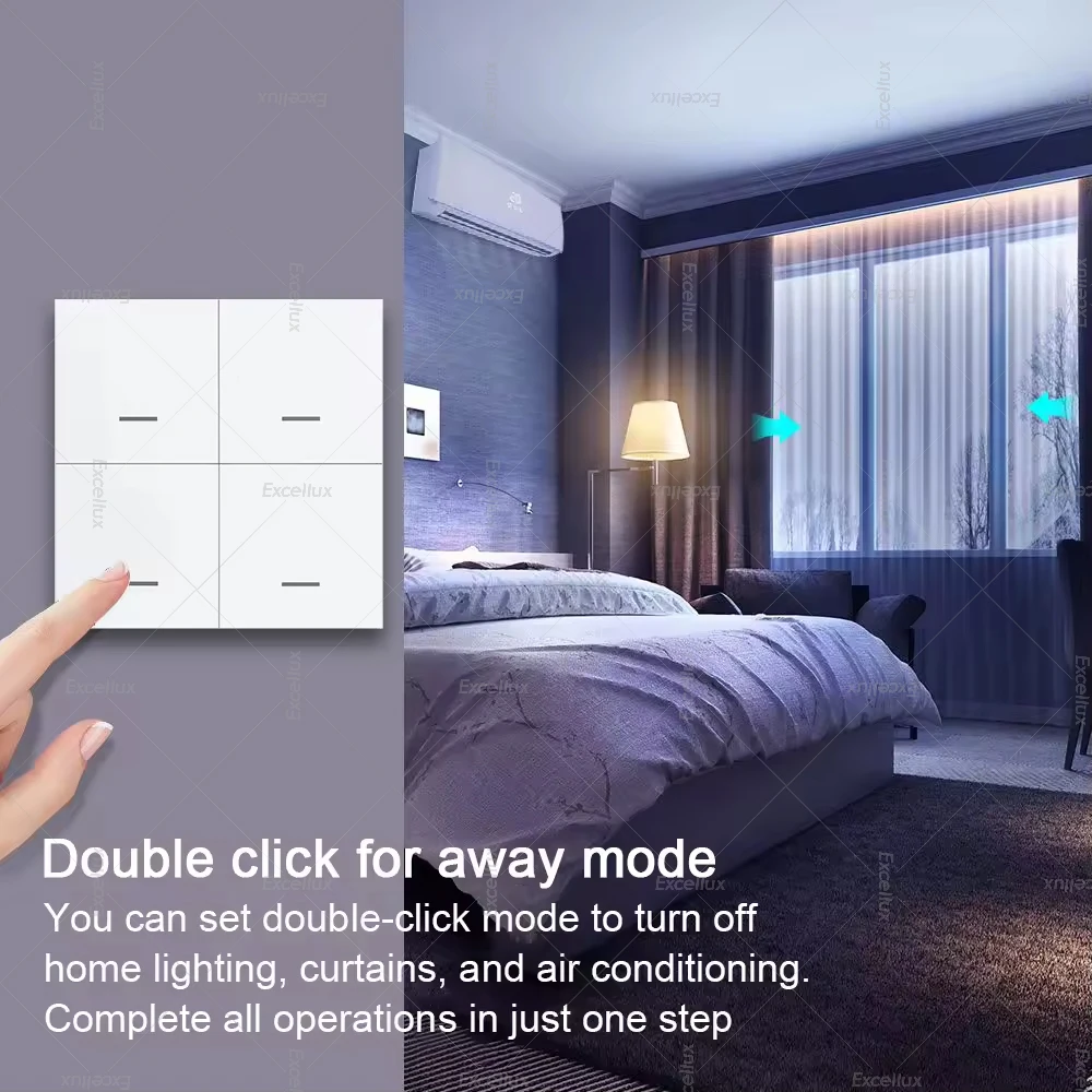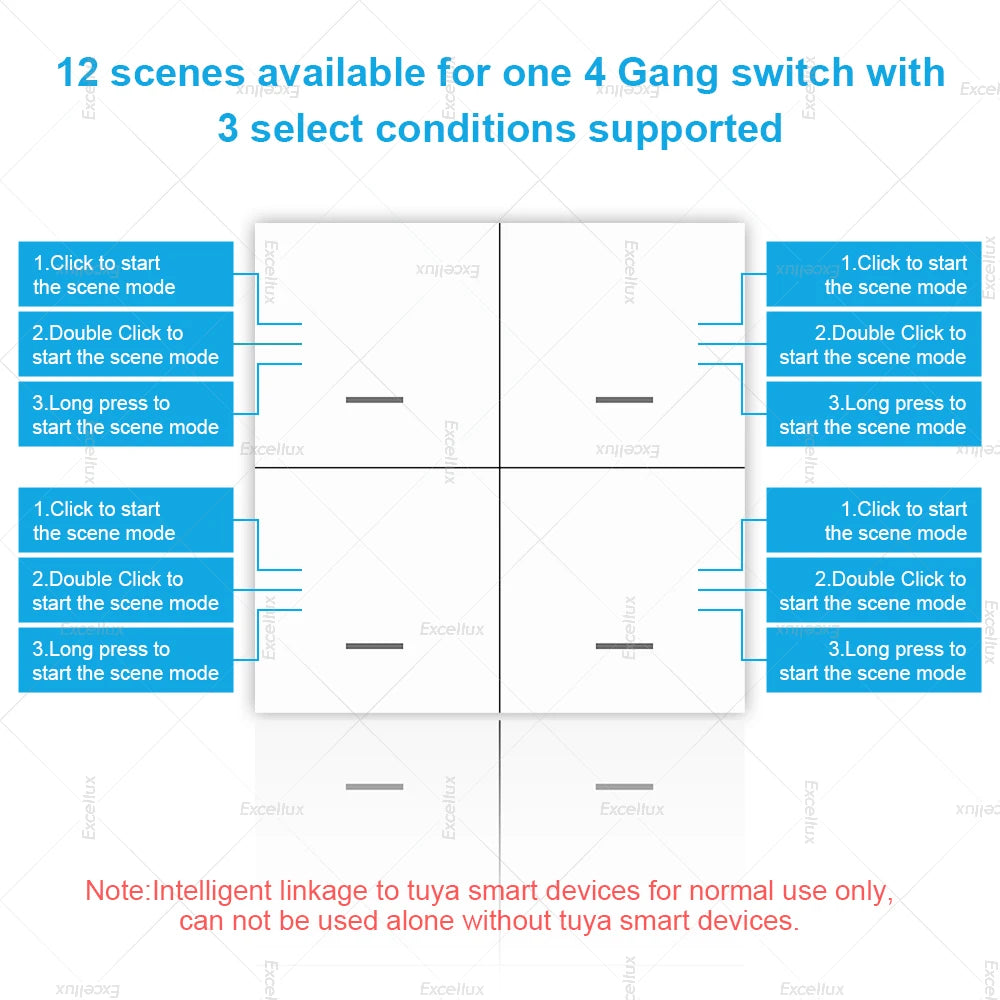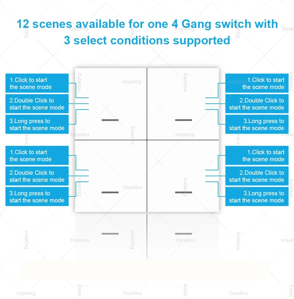 2.【Push Button Design】This switch has 4 buttons, each of which can set 3 scene modes (click, double-click, and press). Three pairing modes for each button to achieve 12 scenes from one 4 gang scene switch,such as away mode,home mode,sleep mode,etc.To create any smart automation as you want on your smart phone app to start your another intelligent lifestyle. Excellux global store .