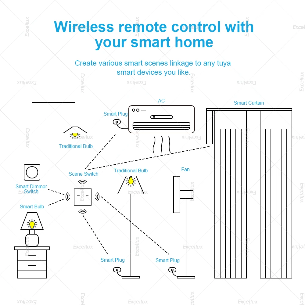 1.【Wireless Remote Control】Smart automate the ZigBee wireless scene switch to any smart devices in App to set various scenes for your smart home. Excellux global store .Tap-to-run to get another easier control for all smart devices with one key on the switch.Each switch button can satisfy multiple needs, realizing different scenes.Imagine the smart linkage to create an infinite space with the wire scene switch.
