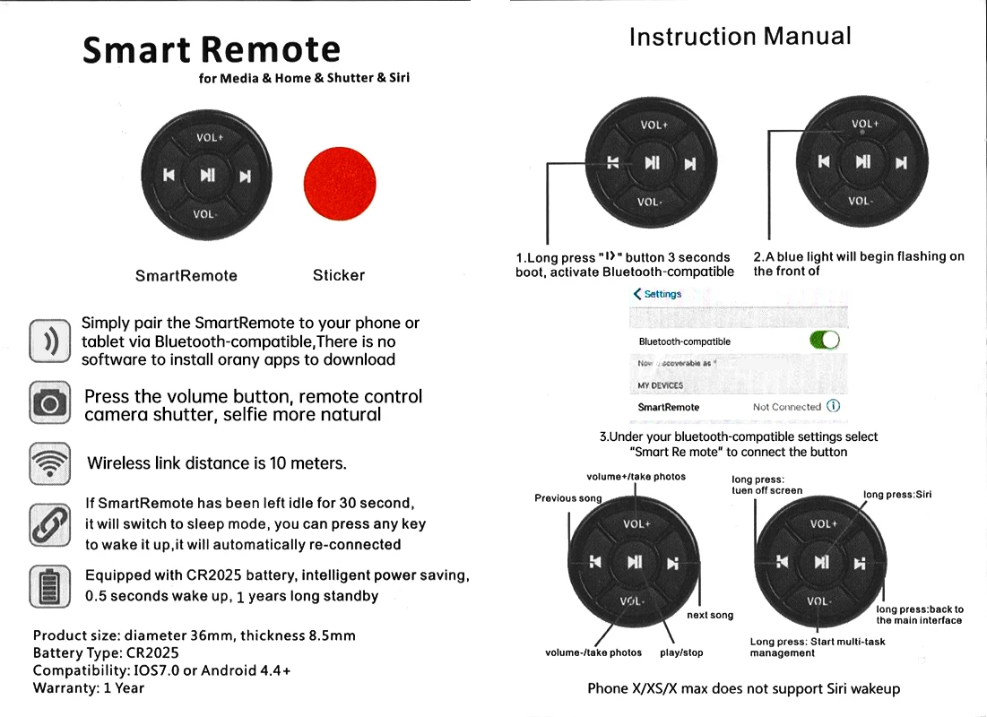 1. This remote control only supports Bluetooth-compatible connection for mobile phones and tablets, and does not currently support other Bluetooth-compatible enabled devices. (such as car Bluetooth-compatible, MP3, e-book readers)